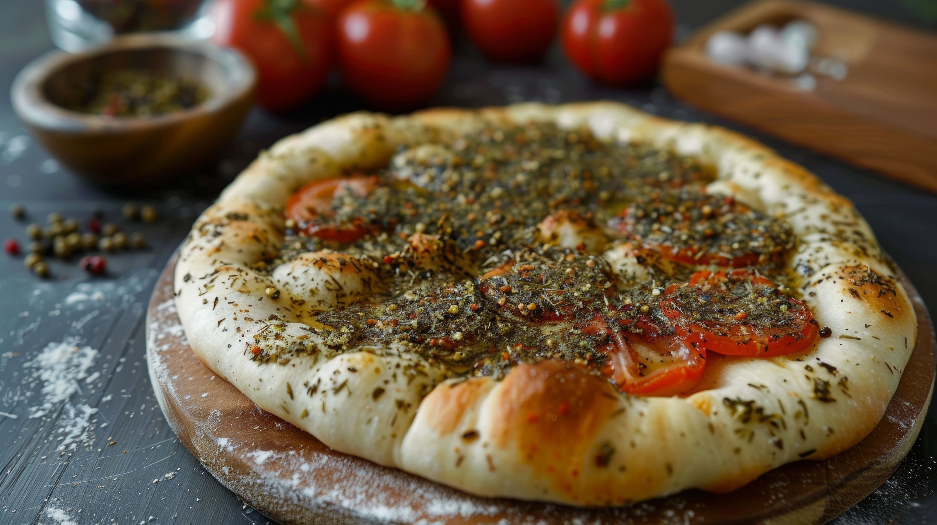 - Jerusalem Zaatar (8 oz) A fragrant, earthy blend of wild thyme, sesame seeds, and sumac—perfect for sprinkling over warm pita or mixing with olive oil for dipping.